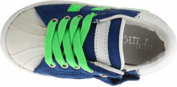 Deze sportieve sneakers van Pinocchio zijn gemaakt van blauw leer en afgewerkt met (neon) groene strepen. De kinderschoenen zijn van binnen gevoerd met leer en hebben een uitneembaar voetbed. Dit model beschikt over een vetersluiting.