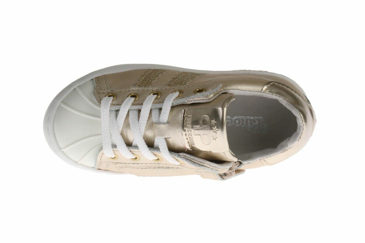 Goudkleurige leren sneaker met metallics en glitterstrepen voor meisjes van het merk Pinocchio. Pinocchio is een Nederlands merk dat gespecialiseerd is in het fabriceren van trendy kinderschoenen. De productie vindt plaats in Europa. Al meer dan 40 jaar verzorgt het merk schoenen van hoogwaardige materialen en een goede pasvorm in allerlei kleuren. Zo ook deze sneaker met rubberen neus, uitgevoerd in goudkleurig leer met twee glitterstrepen aan de buitenzijde van de wreef. Een patch van het merkembleem prijkt op de tong en is evenals de achterbies uitgevoerd in goudkleurig metallic leer. Een rits- en klittenbandsluiting aan de binnenzijde van de wreef helpt het aan- en uittrekken te versoepelen. Het binnenwerk bestaat volledig uit leer, het uitneembare voetbed is te vervangen door een persoonlijke inlegzool. Een stevig contrefort draagt bij aan het comfort. Verder heeft de bijpassende rubberen loopzool een fijn profiel voor een stevige grip.