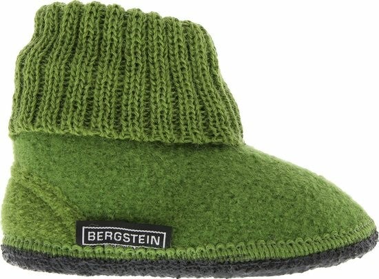 Kids Cozy pantoffel van Bergstein. Deze pantoffel is van ruwe wol en heeft een gebreide omslag. De pantoffel heeft een kunststof buitenzool.