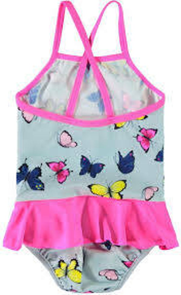 Een meisjes badpak met een all over print van vlinders in verschillende kleuren, afgeboord met fel roos.Dit badpak is nog voorzien van een zwem pamper.